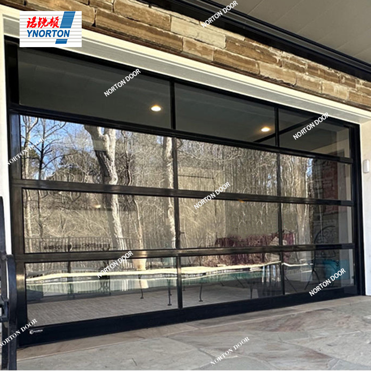 La porte de garage en verre aluminium personnalisée Qingdao Norton utilise généralement des matériaux en verre à haute résistance et haute sécurité tels que le verre trempé ou le verre feuilleté pour garantir la transparence et la durabilité du corps de la porte.